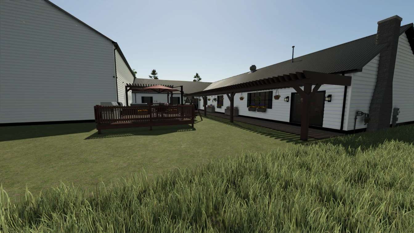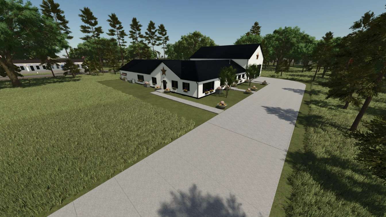 Dies ist ein Bauernhaus, das für Rollenspiele, zum Schlafen und Umziehen genutzt wird. Die Garage kann zur Lagerung von Fahrzeugen und/oder Ausrüstung genutzt werden. Das Haus verfügt über drei Schlafzimmer, drei Badezimmer, eine Wohnküche, einen Waschraum, ein Wohnzimmer, ein Büro, ein Spielzimmer, eine gemütliche Veranda und eine angeschlossene 75×50 große Garage/Werkstatt. Diese Version für FS25 verfügt über die originale Ziegelfassade des Hauses sowie die Option einer farblich wählbaren Verkleidung.