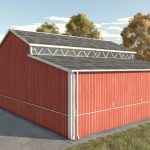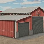 Einfache Holzgarage in roter Farbe, in der man Maschinen oder Erntegut lagern kann.