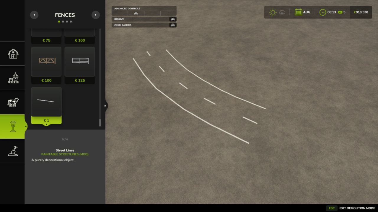 Dieses Paket enthält fräsbare Straßenlinien, die sich unter Zäunen befinden. Sie können sie verkaufen, indem Sie auf den Anfang der Linie klicken.