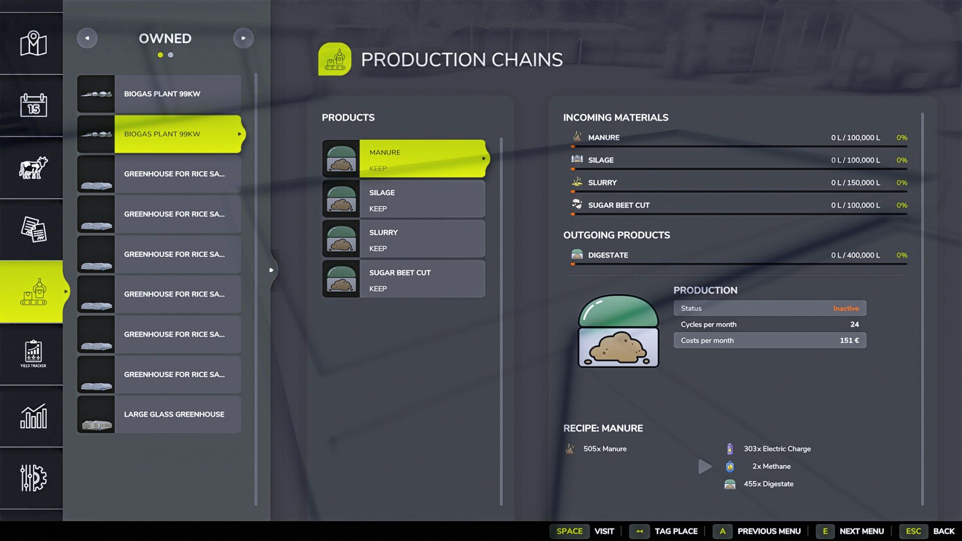 Kapazität: 100.000 l (Mist, Silage, geschnittene Rüben), 150.000 l (Gülle), 400.000 l (Gärrest)