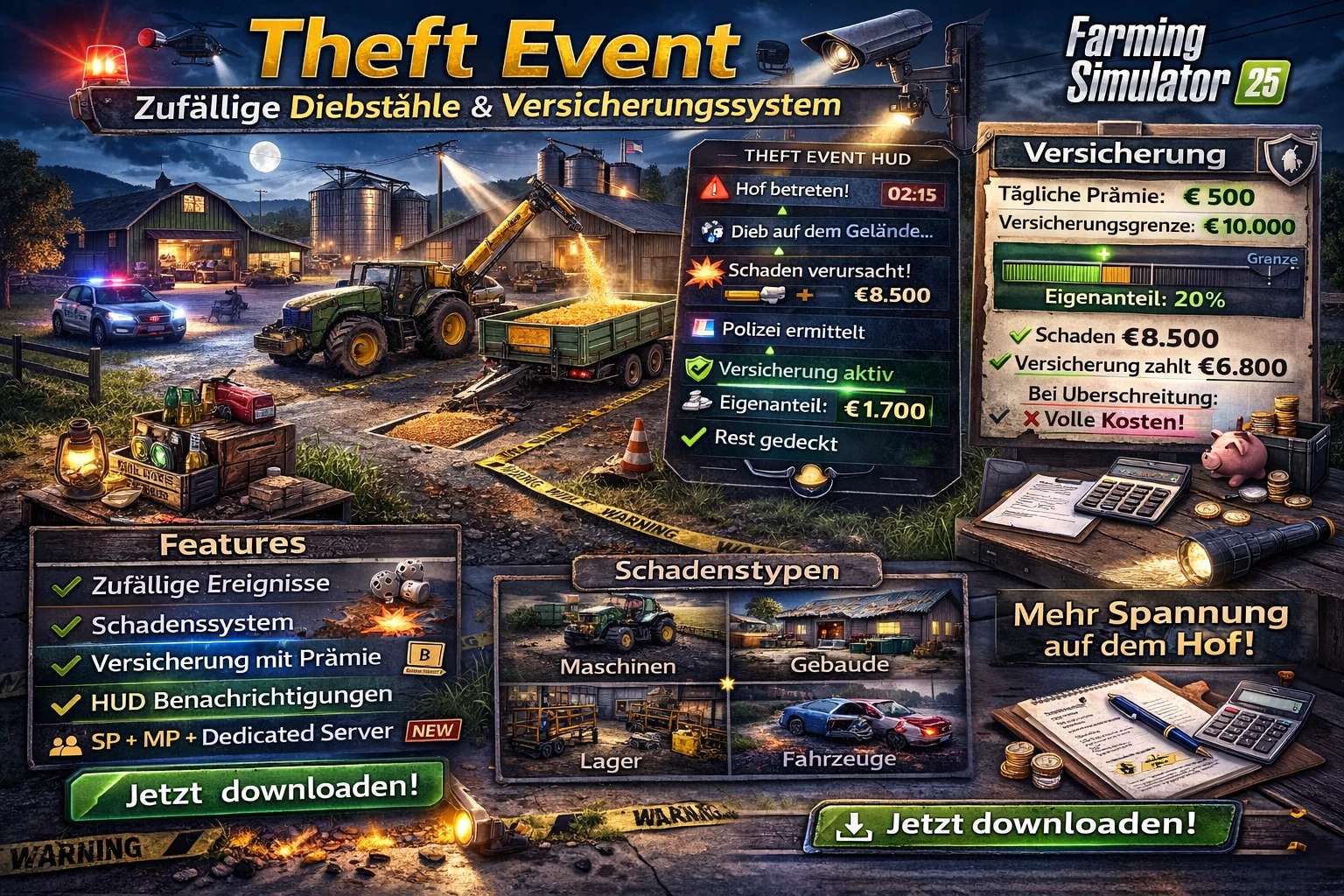 Die Erweiterung „Diebstahl-Event“ fügt dem Landwirtschafts-Simulator 25 zufällige Diebstähle hinzu. Nachts kann ein Einbrecher in Ihren Hof eindringen und Schaden anrichten. Eine tägliche Versicherung reduziert das finanzielle Risiko und benachrichtigt Sie über das HUD.