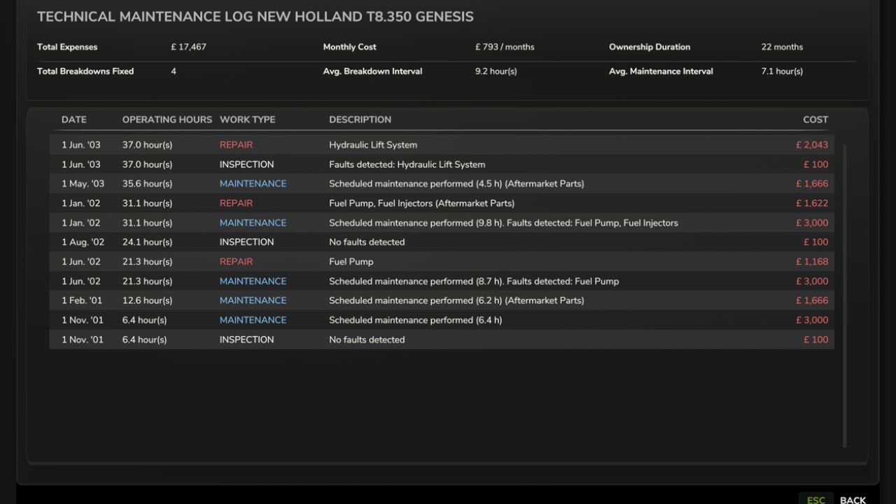 Das Werkstattmenü umfasst nun Inspektion, Reparatur, Wartung und Generalüberholung. Jeder Vorgang benötigt echte Spielzeit, sodass die Reparaturplanung Teil des normalen Fahrzeugmanagements wird.