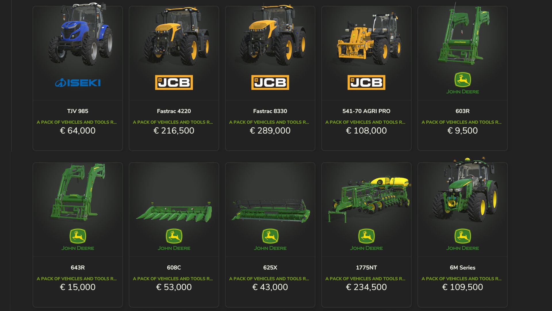 JohnDeere – Frontlader 603R, Frontlader 643R, Schneidwerk 608C, Schneidwerk 625X, Pflanzmaschine 1775NT