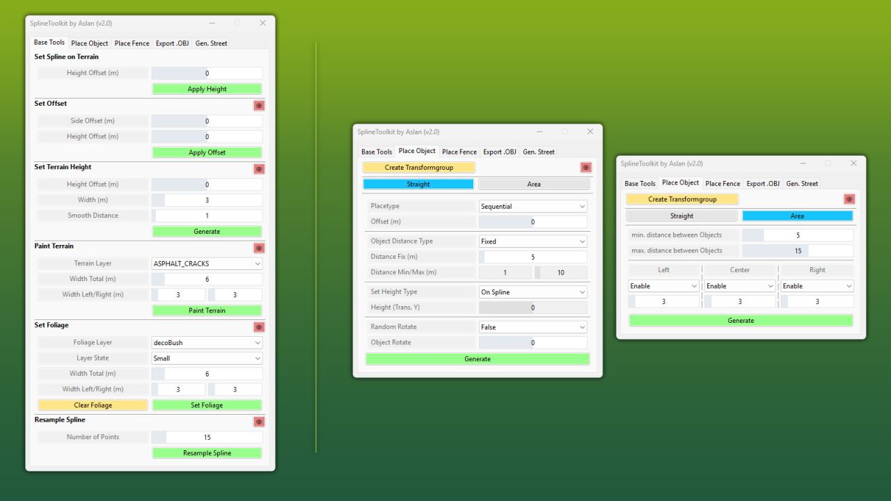 Das SplineToolkit ist ein umfassendes GIANTS-Editor-Skript, das eine Vielzahl von Spline-Werkzeugen in einem einzigen Paket vereint. Nahezu alle Funktionen bieten eine Echtzeit-Vorschau direkt im Editor-Ansichtsfenster.
