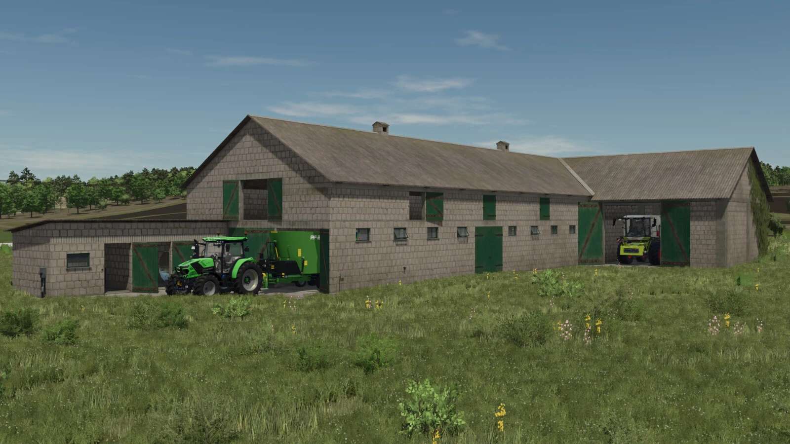 Es ist mit einer kompletten Beleuchtung, einer manuell betriebenen Melkmaschine, einem Büro, einem separaten Platz für den Milchtank, einem Werkzeugraum und einem hohen Durchgangsraum ausgestattet.