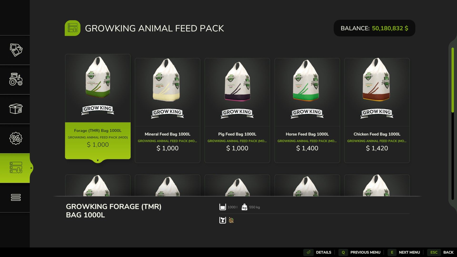 – Futter (TMR) als käuflicher Beutel hinzugefügt. Es kostet 1000 $ pro 1000 Liter
