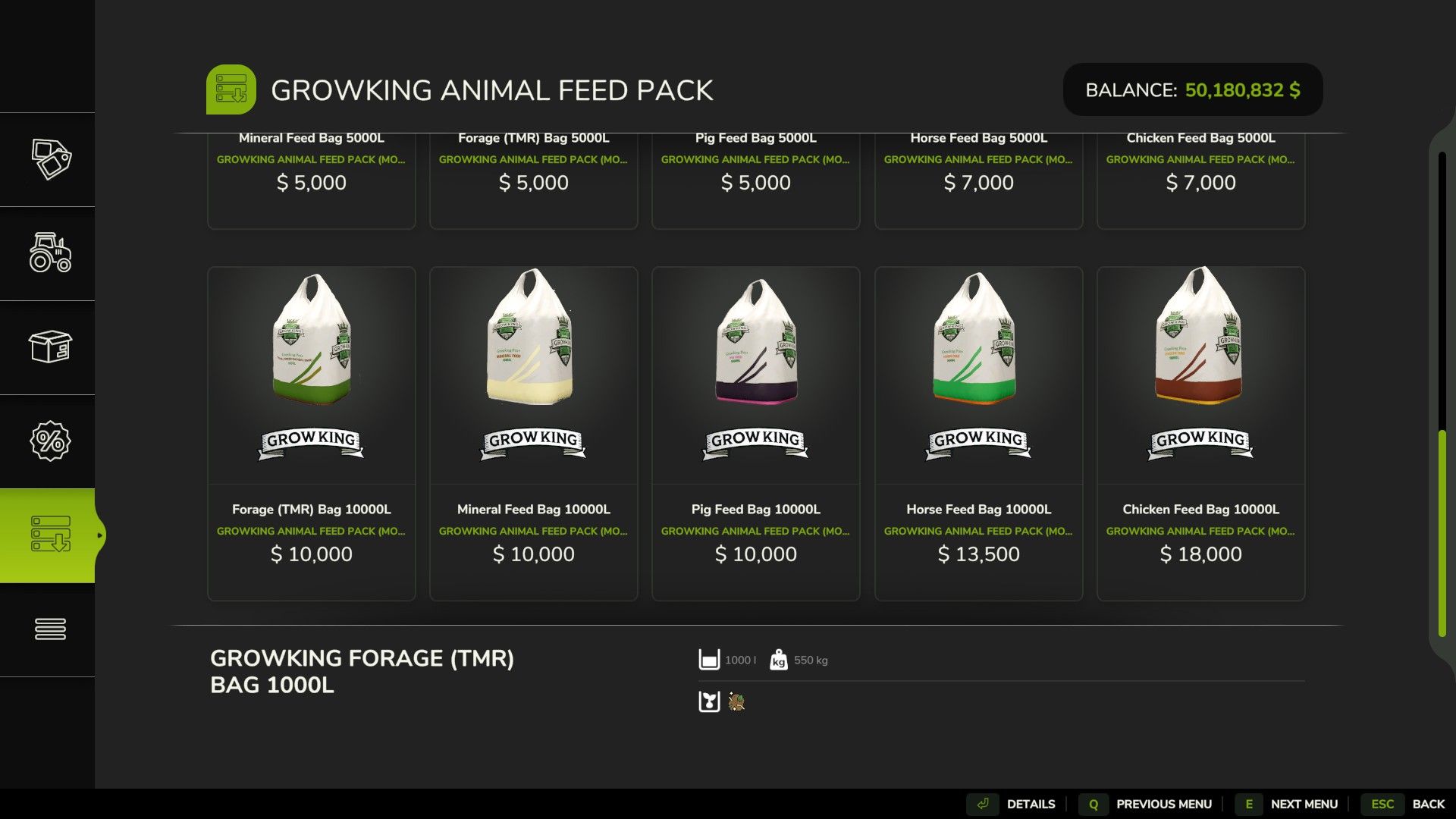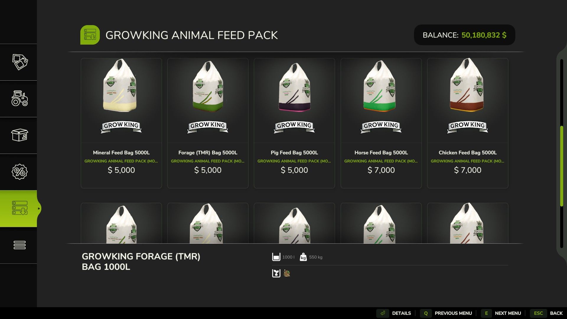 – Futter (TMR) als käuflicher Beutel hinzugefügt. Es kostet 1000 $ pro 1000 Liter