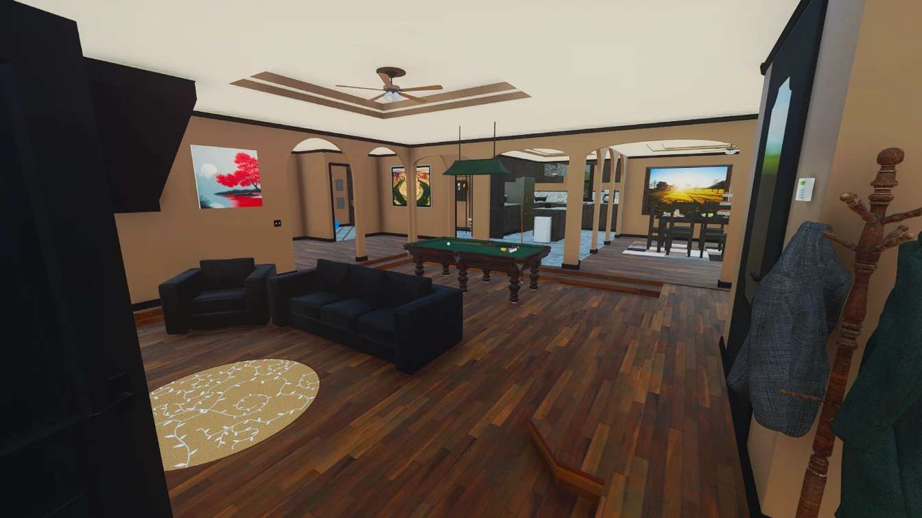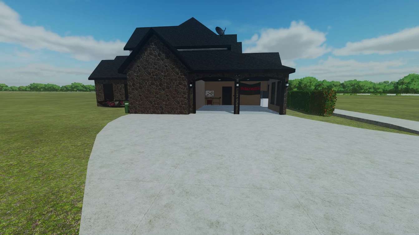 Dies ist ein detailliertes Bauernhaus mit 4 Schlafzimmern, darunter die Master Suite, 3 Badezimmern, Küche, Esszimmer, Waschküche, Arbeitszimmer, einer angeschlossenen Garage für 2 Autos und einer kleinen hinteren Terrasse. Diese Version für 25 Personen verfügt auch über farblich wählbare Funktionen. Die Auffahrt, Cornhole-Bretter und Büsche an der Vorderseite wurden entfernt.