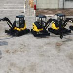 JonhDeere Raupen-Kompaktbagger mit Schaufel. Dank des Nullheckschwenkradius ist dieser Kompaktbagger besonders wendig und äußerst produktiv in beengten Verhältnissen.