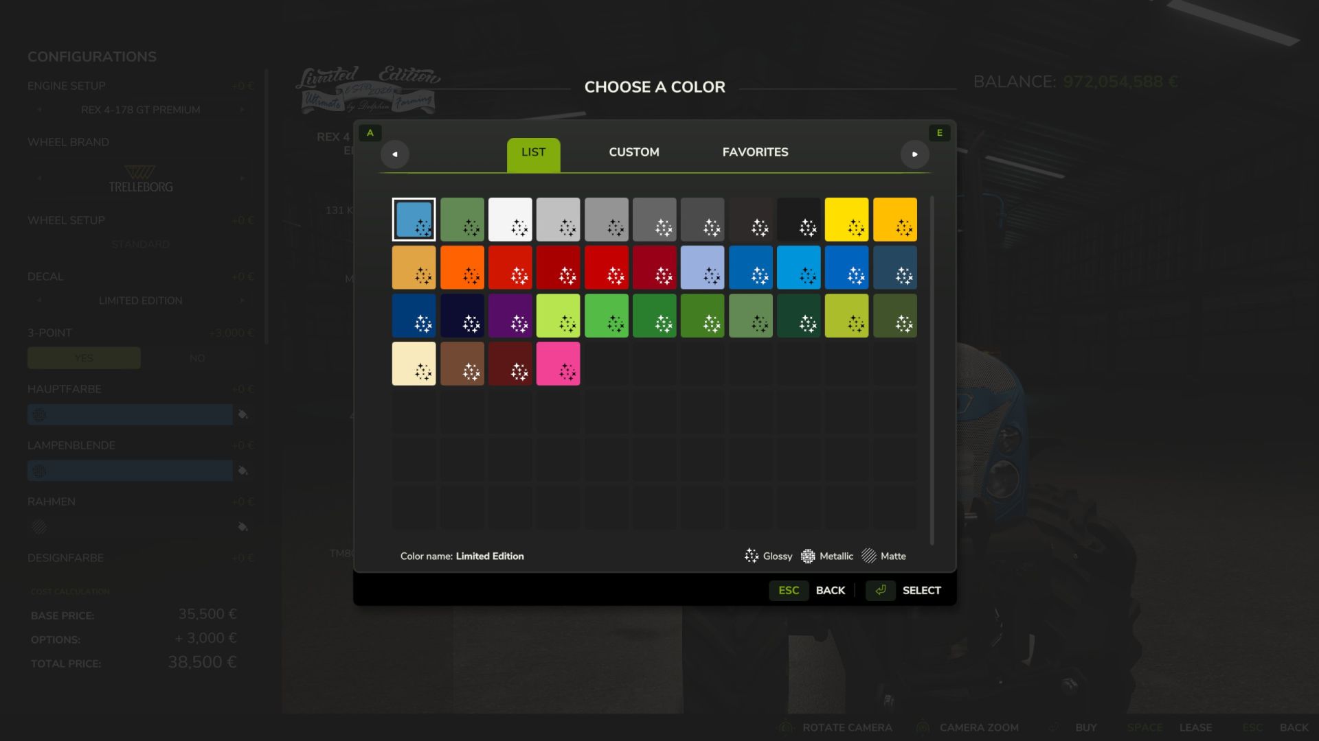 Farbauswahl für Hauptfarbe, Scheinwerferblende, Rahmen, Designfarbe, Innendesign, Innendesign 2, Innendesign 3, Motoraufkleber, Gitter und Felgenfarbe.