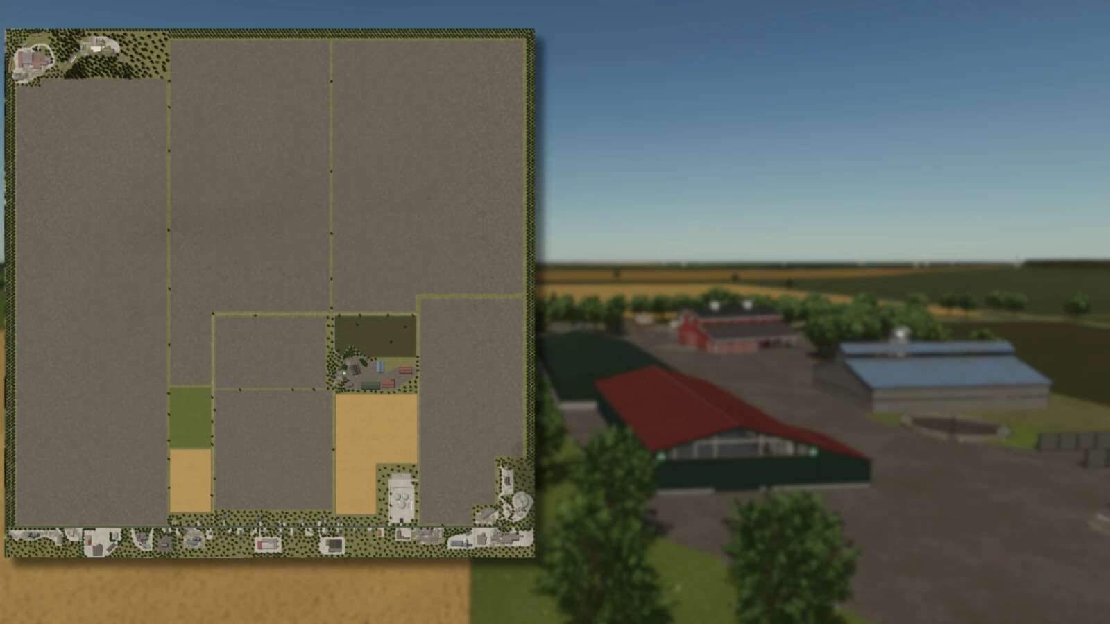Dies ist eine fiktive Karte, auf der man Landwirtschaft, Forstwirtschaft und Viehzucht betreiben kann. Es ist wunderschön, und die Felder sind sehr groß.