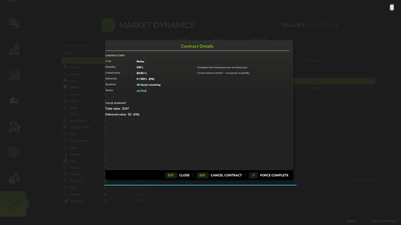 Mod-Integrationen – FS25_BetterContracts: Der Abschluss eines Erntevertrags führt zu einem kurzzeitigen Angebotsschub für die entsprechende Ernte. FS25_UsedPlus: Vertragsergebnisse fließen in Ihre Kreditwürdigkeit ein, die wiederum die Standardstrafe beeinflusst. Beide Integrationen werden automatisch aktiviert.