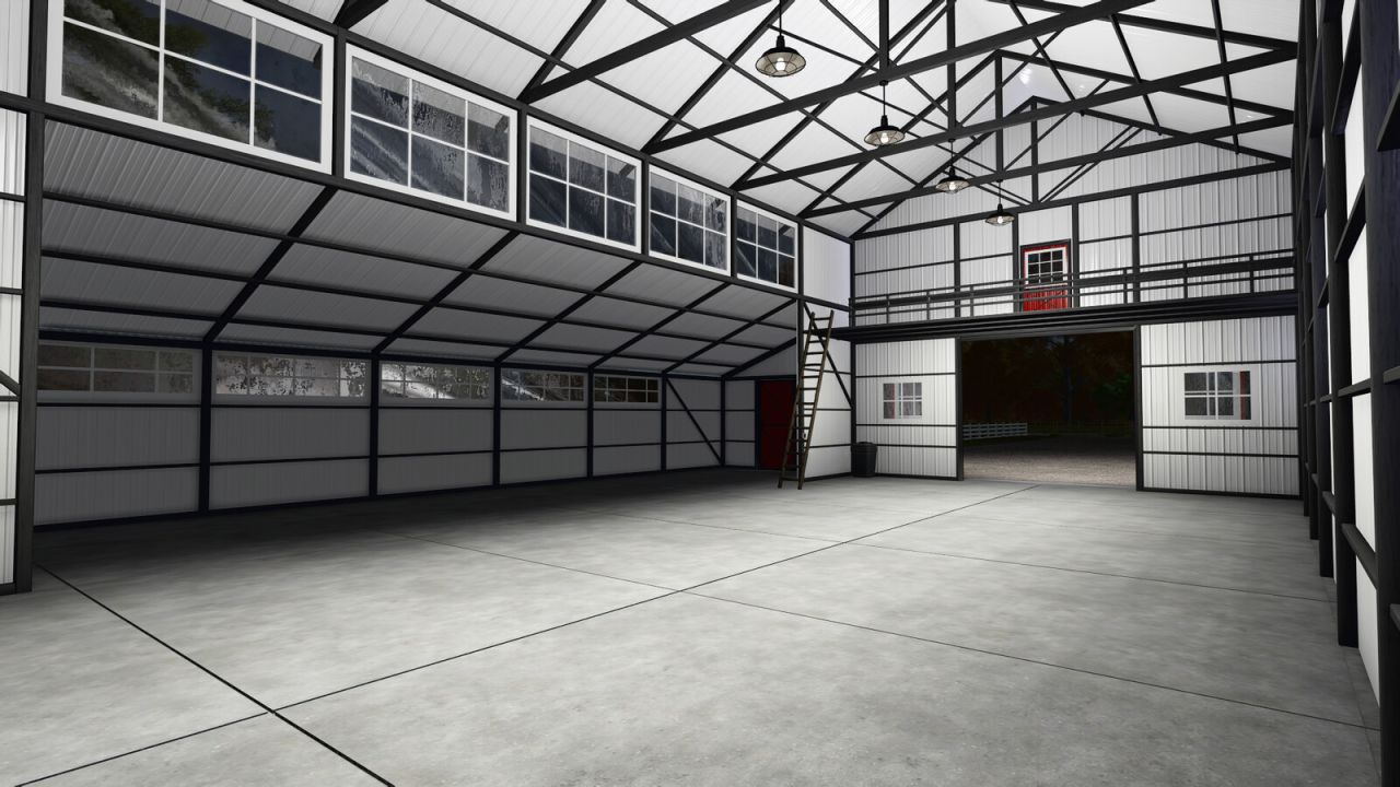 Mittelgroßer Schuppen mit zwei Schiebetüren unten und einer einzelnen Schiebetür oben. Hier können Sie Ihre Maschinen und Getreide lagern.