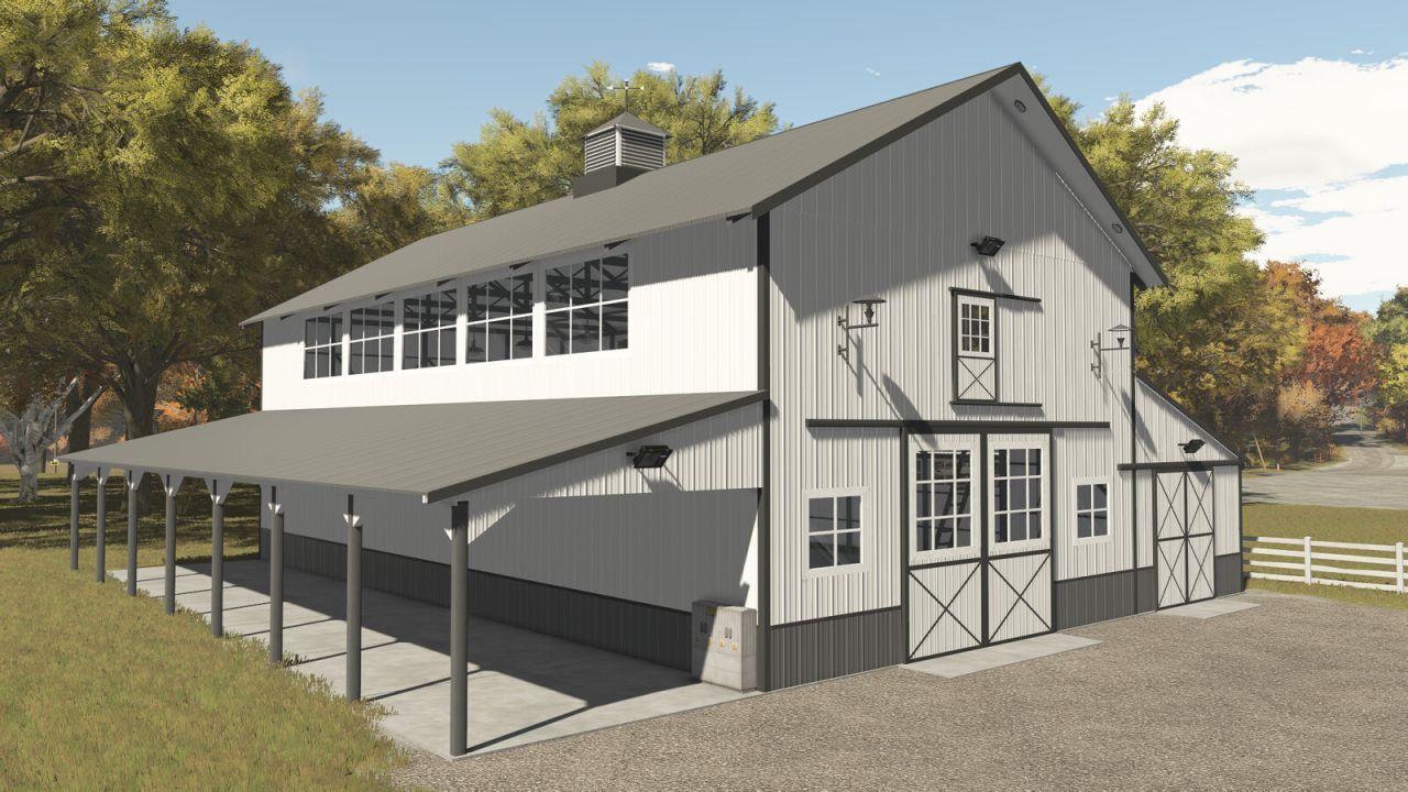 Mittelgroßer Schuppen mit zwei Schiebetüren unten und einer einzelnen Schiebetür oben. Hier können Sie Ihre Maschinen und Getreide lagern.
