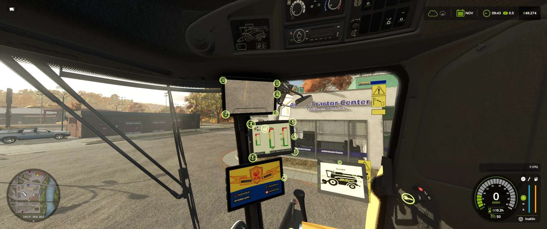 Innenraum-IC: Leiter ein-/ausklappen, alle Monitore ein-/ausschalten, zwischen 4 Anzeigen auf dem Hauptmonitor (die ebenfalls ICs haben) umschalten, Rundumleuchte ein-/ausschalten, Beleuchtung der vorderen/hinteren Förderschnecke ein-/ausschalten, Scheibenwischer einmal wischen, Korntank öffnen/schließen, Motor starten/stoppen, Dreschtrommel (Schneidwerk) ein-/ausschalten, Förderschnecke ein-/ausklappen.