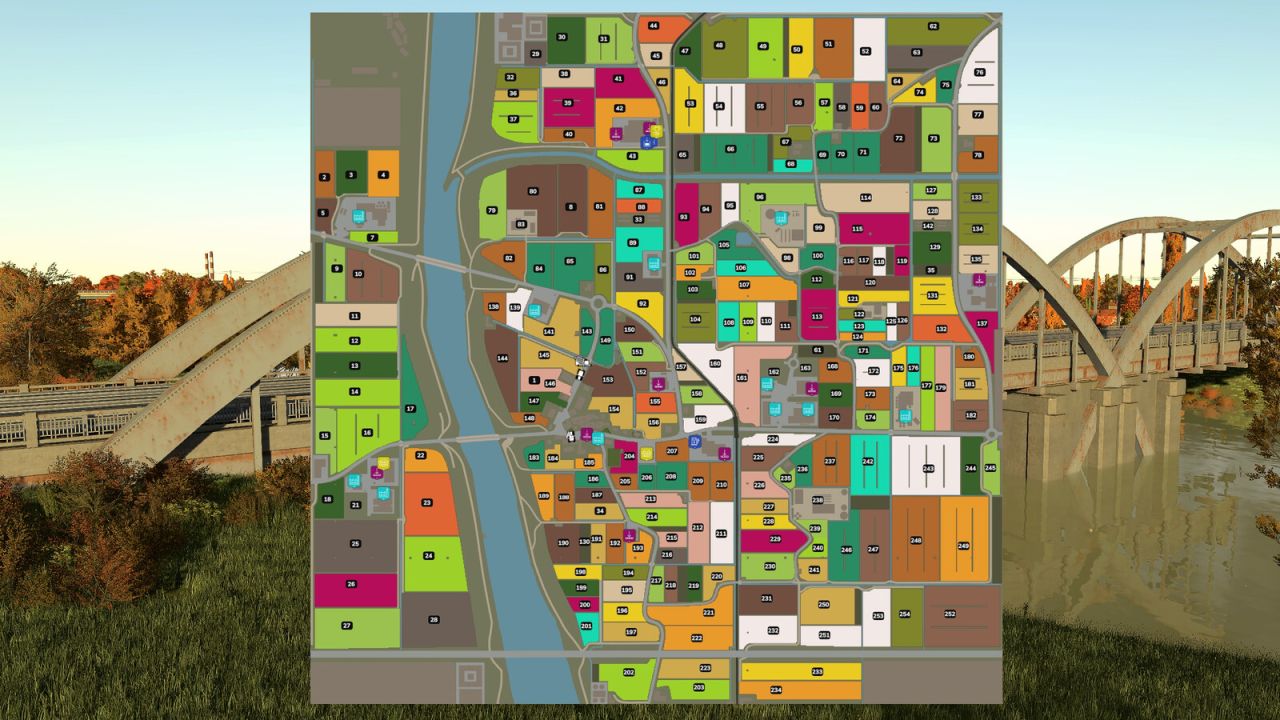 – Ackerland Nr. 1 ist das Gebiet um den Fluss und um die Hauptstraße (das Spiel platziert die Nummer des Ackerlandes in der Nähe des Feldes Nr. 146). Kaufen Sie es für 0 $, um in diesen Gebieten Gras zu mähen