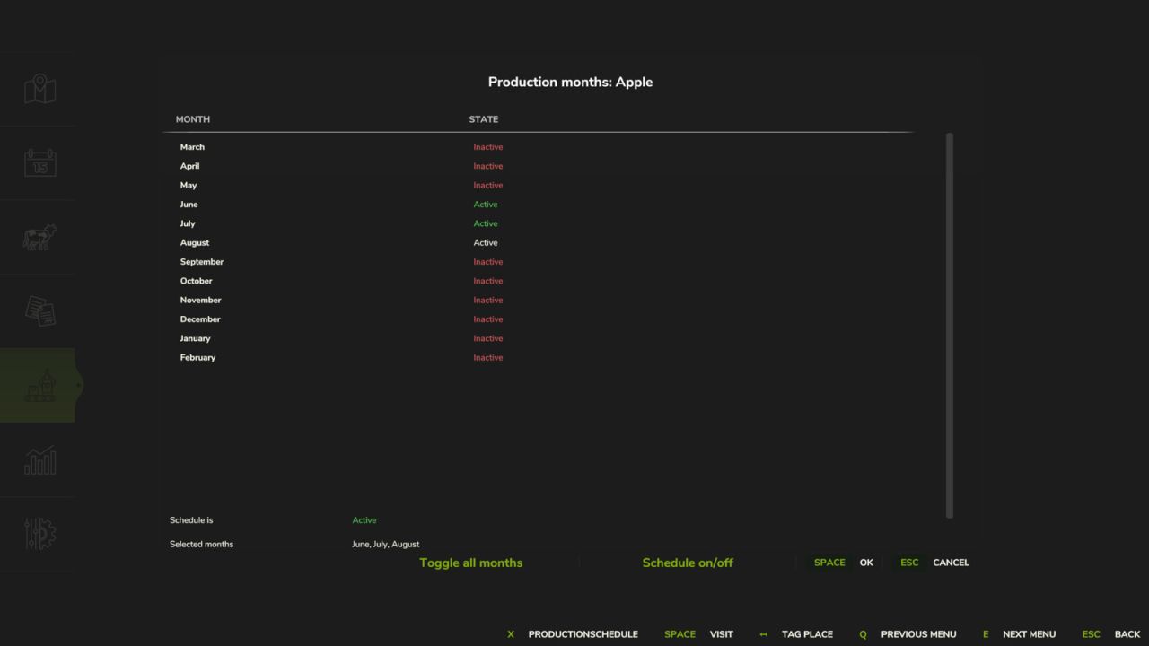 Ermöglicht es Ihnen, die Monate festzulegen, in denen die einzelnen Produktionsschritte einer Produktionsstätte aktiv sein sollen.