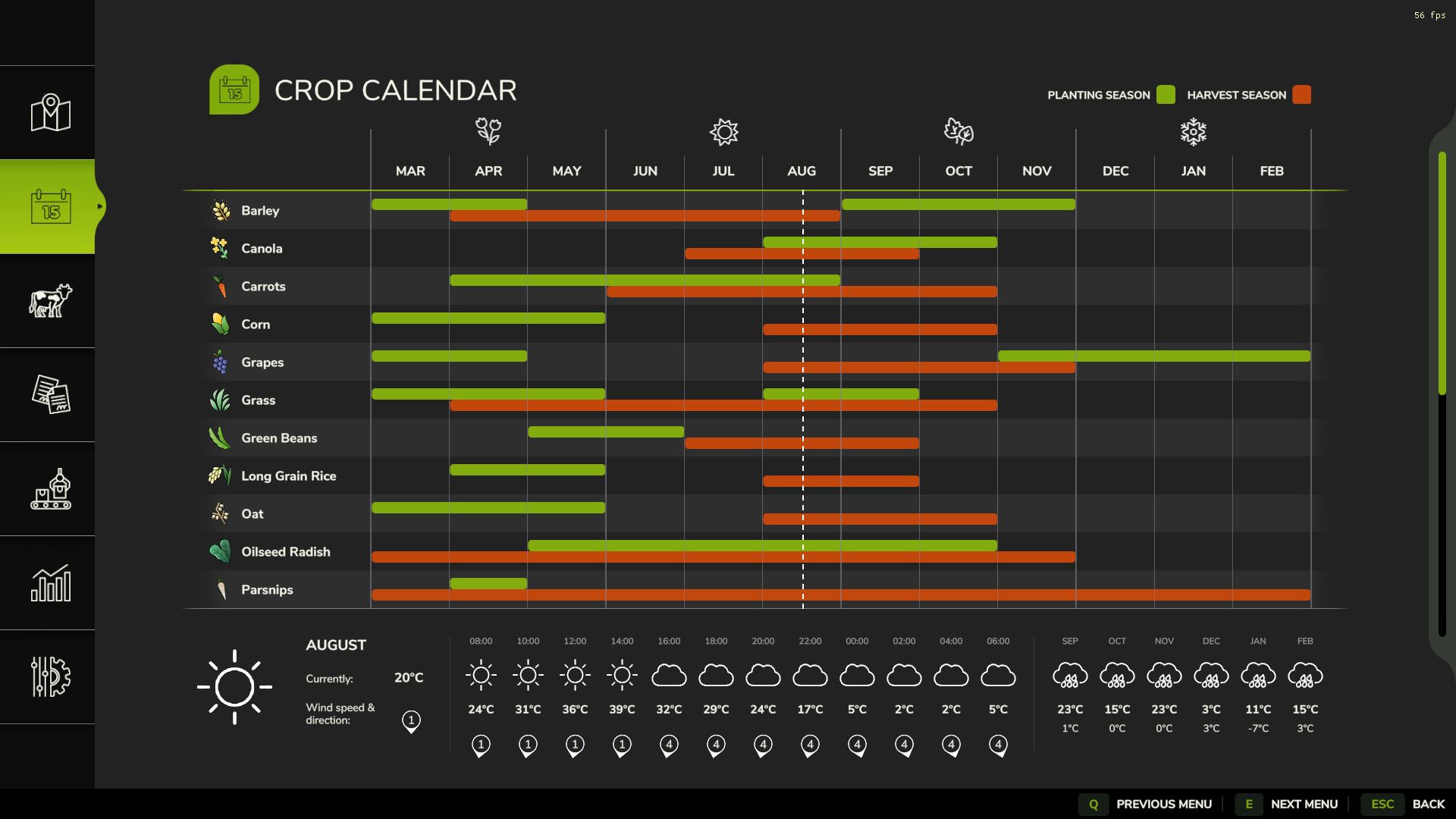Bedenken Sie, dass Ihre Vorhersagen ohne Wetterstation (wie im Screenshot) nicht ganz genau sind. Sie können eine im Baumenü unter „Werkzeuge“ kaufen. Es gibt auch einige Mods für mehr Abwechslung.