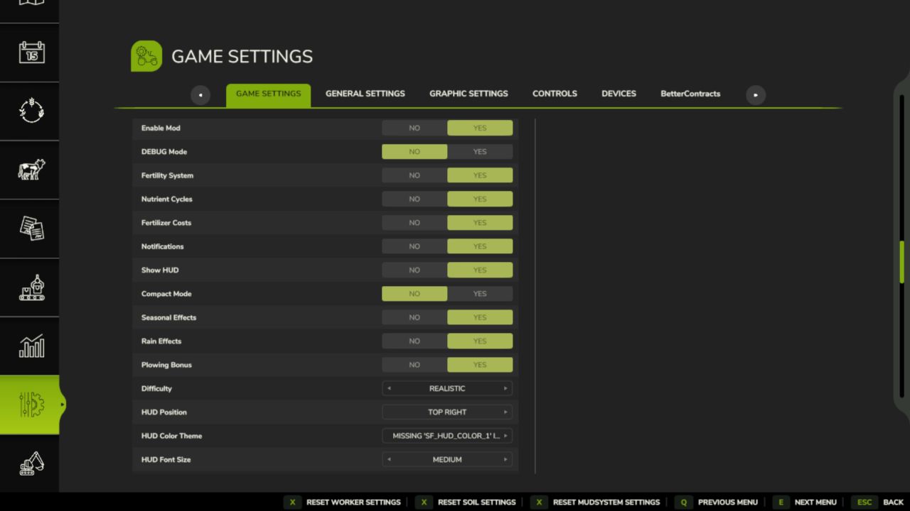 Alle Einstellungen befinden sich im Spielmenü unter „Boden & Dünger“. Im Mehrspielermodus werden die Spieleinstellungen vom Administrator gesteuert. HUD-/Anzeigeeinstellungen sind immer spielerspezifisch.