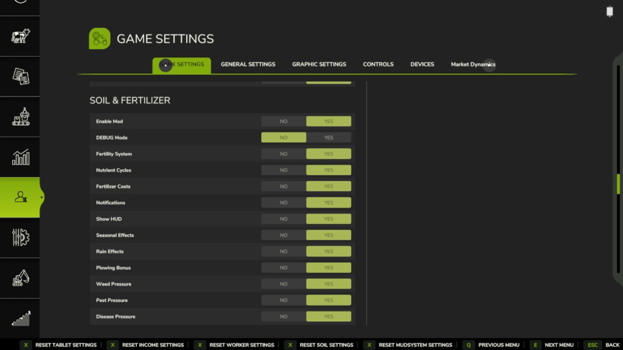 Alle Einstellungen befinden sich im Spielmenü unter „Boden & Dünger“. Im Mehrspielermodus werden die Spieleinstellungen vom Administrator gesteuert. HUD-/Anzeigeeinstellungen sind immer spielerspezifisch.