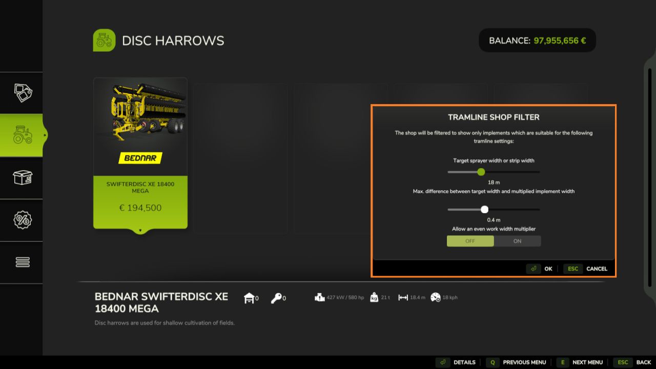 Mit diesem Mod können Sie den Shop nach Arbeitsbreiten filtern, die mit einer Ziel-Fahrgassen- (oder Streifen-)Breite kompatibel sind.