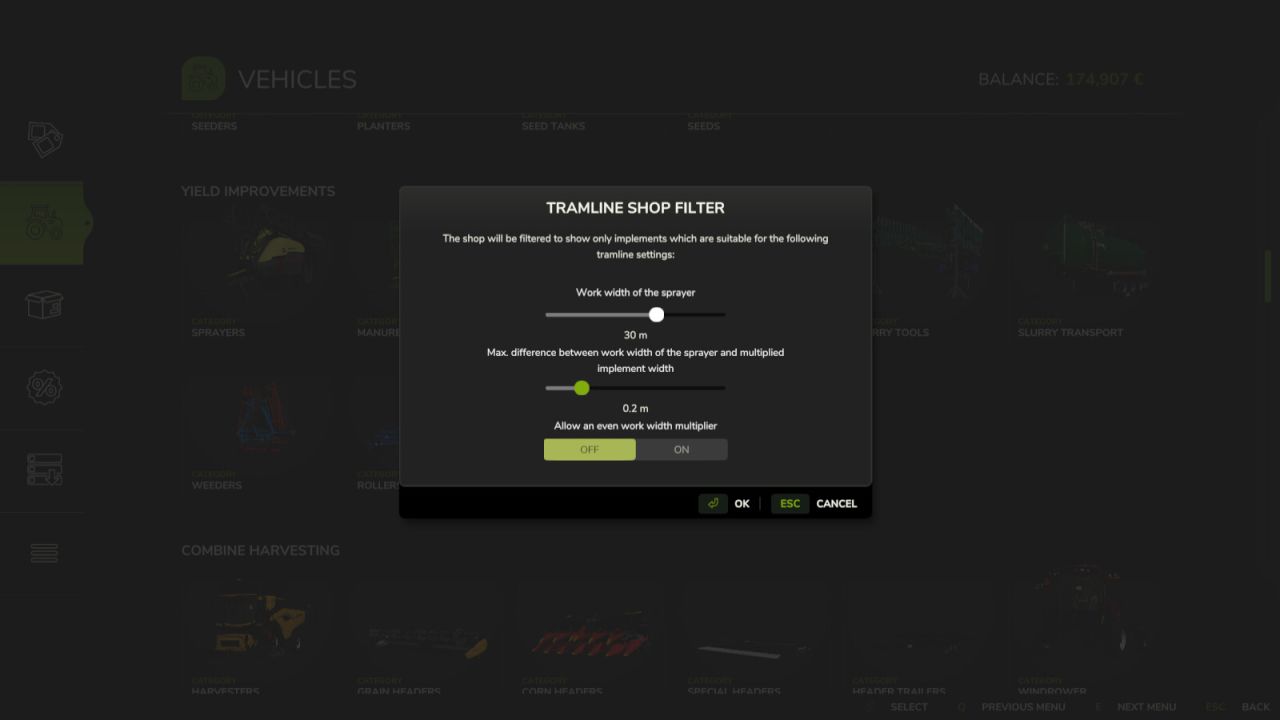 Mit diesem Mod können Sie den Shop nach Arbeitsbreiten filtern, die mit einer Ziel-Fahrgassen- (oder Streifen-)Breite kompatibel sind.