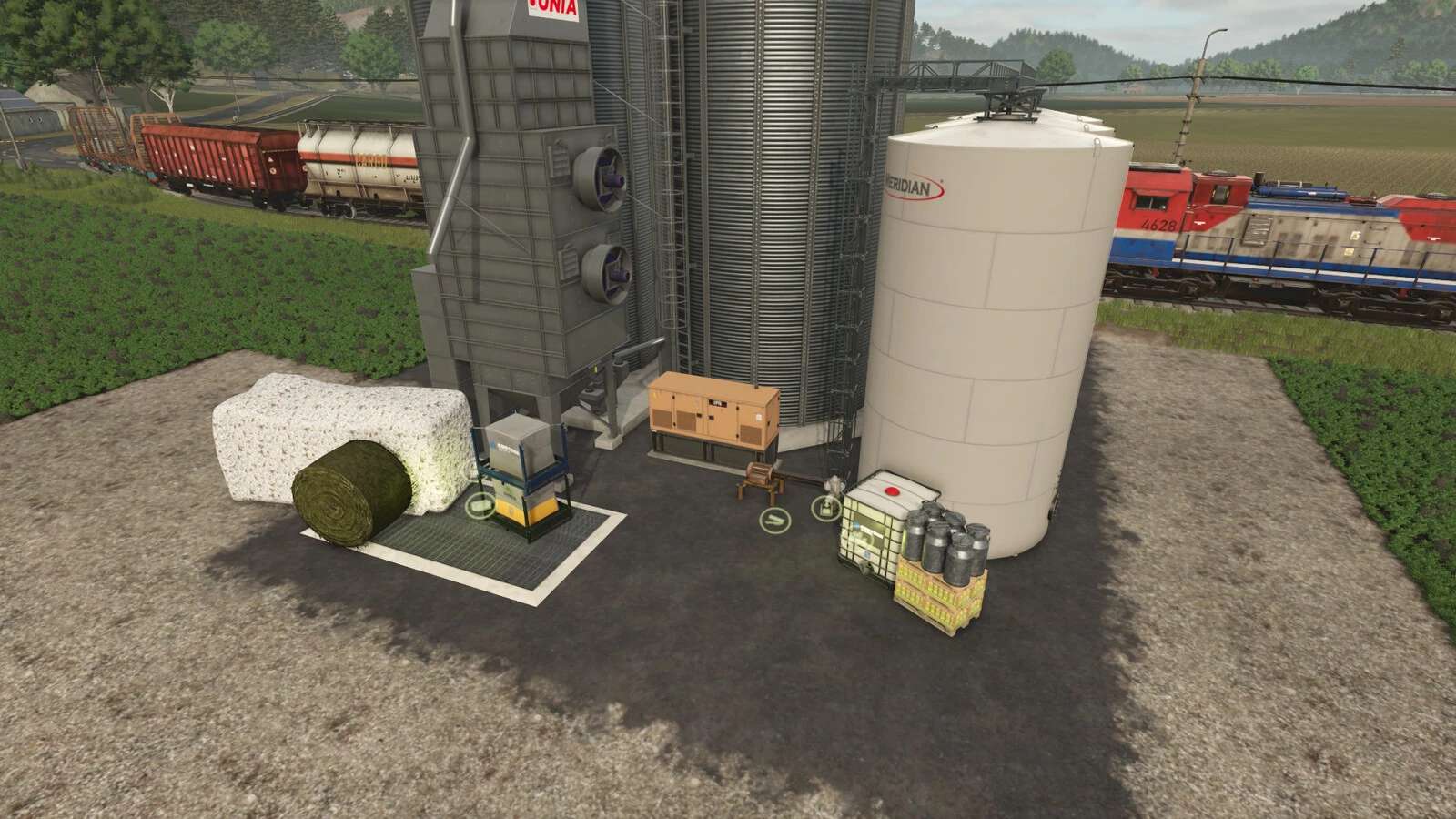 PLATZIERUNG: Damit die Zugseite des Silos über den Gleisen hängt, muss das eigene Feld so nah wie möglich an den Gleisen liegen oder ein „Place Anywhere“-Mod verwendet werden.